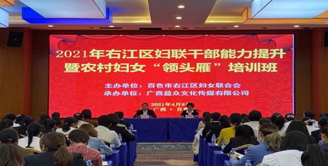 ????????為提高新一屆村(社區(qū))婦聯(lián)主席業(yè)務水平和履職能力,提升婦女干部的內(nèi)在素質(zhì),盡快進入婦聯(lián)工作角色,4月8日至9日,百色市右江區(qū)婦女聯(lián)合會主辦,廣西益眾文化傳媒有限公司承辦2021年右江區(qū)婦聯(lián)干部能力提升暨農(nóng)村婦女“領頭雁”培訓班,來自各鄉(xiāng)鎮(zhèn)(街道)、村(社區(qū))婦聯(lián)主席或負責婦聯(lián)工作同志、執(zhí)委等一百多人參加本期培訓。