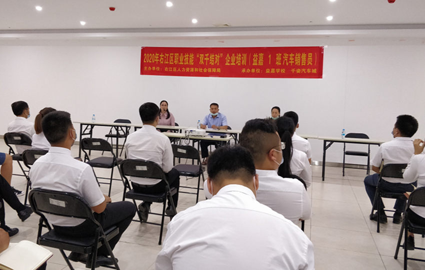 近日,由百色市右江區(qū)人力資源和社會保障局主辦,廣西百色益嘉職業(yè)技能培訓學校、右江區(qū)新姿投資股份有限公司承辦的2020年右江區(qū)職業(yè)技能“雙千結(jié)對”企業(yè)培訓(益嘉1班汽車銷售員)在千姿汽車城順利開班,培訓期十天,約50名汽車銷售人員參加培訓。