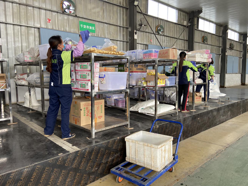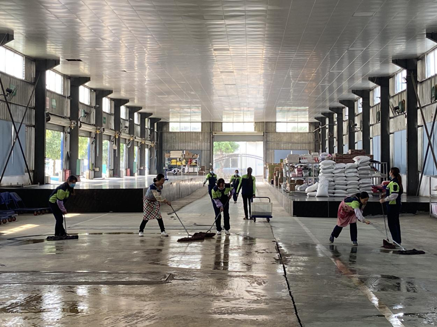 在倉(cāng)庫(kù),員工們對(duì)貨物架、倉(cāng)庫(kù)地板進(jìn)行清潔、擦拭,保證貨物在合適的環(huán)境下儲(chǔ)存。