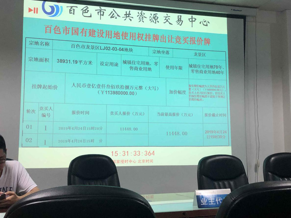 2019年4月24日,百色市龍景區(qū)LJ02-03-04地塊被景益置業(yè)公司以總價11448萬元競得,該地塊為百色市棚戶區(qū)改造項目--那畢片區(qū)一期改造項目A地塊用地。