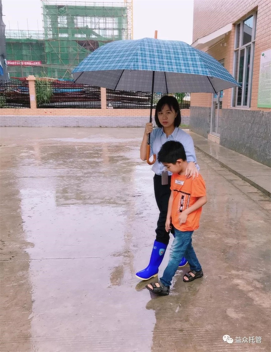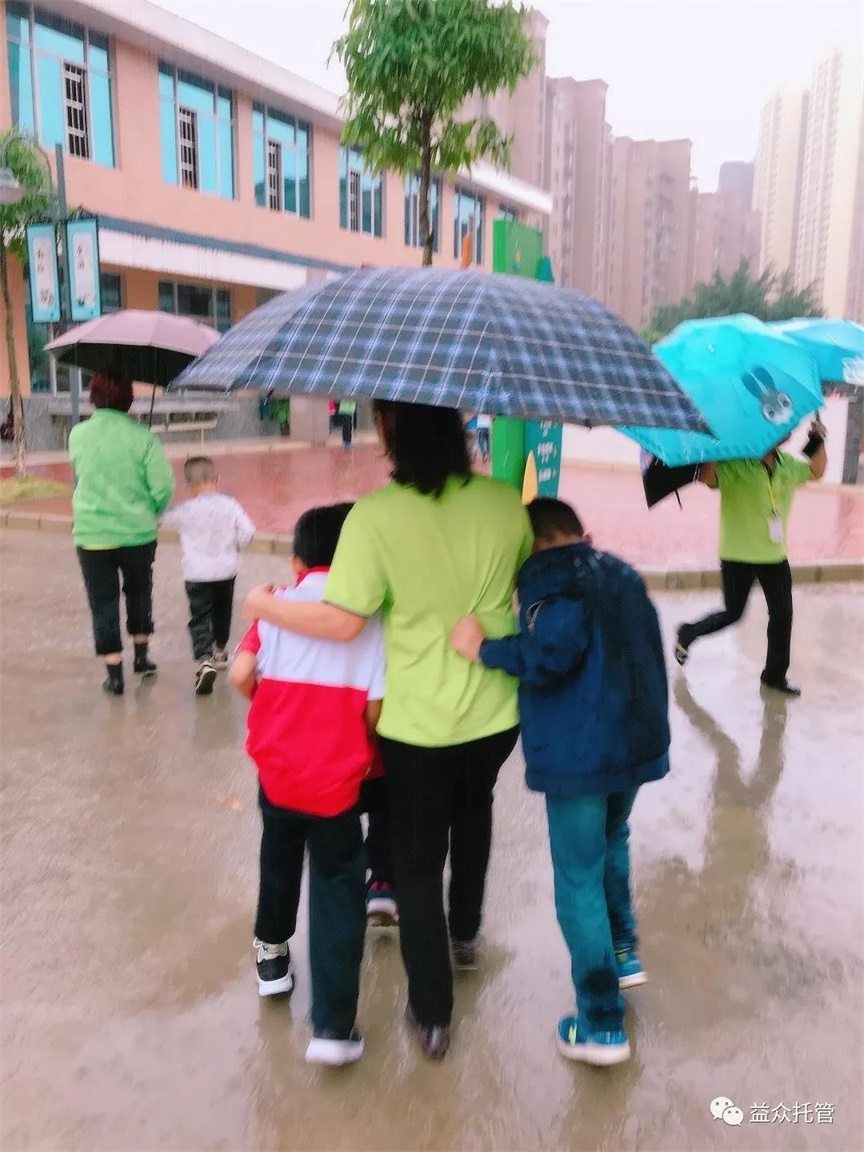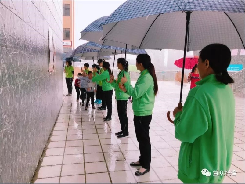 ??? 突如其來的大雨讓孩子們寸步難行,公司各校區(qū)第一時間啟動雨天動線方案。托管老師們撐起雨傘,從教室門口到食堂為孩子們構(gòu)筑了一條無雨通道,護送孩子們到食堂用餐,保障下雨期間的學生人身安全。