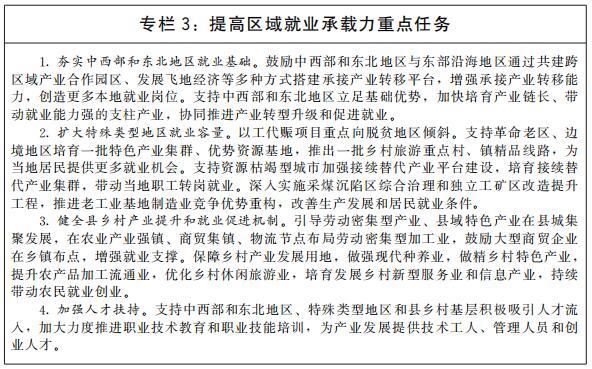 推動(dòng)區(qū)域就業(yè)協(xié)調(diào)發(fā)展。支持東部地區(qū)發(fā)揮創(chuàng)新要素集聚優(yōu)勢(shì),率先實(shí)現(xiàn)產(chǎn)業(yè)升級(jí),開拓高質(zhì)量就業(yè)新領(lǐng)域,培育高質(zhì)量就業(yè)增長(zhǎng)極。加快完善中西部和東北地區(qū)基礎(chǔ)設(shè)施,提升產(chǎn)業(yè)集聚區(qū)公共服務(wù)效能,引導(dǎo)產(chǎn)業(yè)向中西部和東北地區(qū)有序梯度轉(zhuǎn)移,推動(dòng)就業(yè)機(jī)會(huì)向中西部和東北地區(qū)擴(kuò)散。支持中西部和東北地區(qū)根據(jù)國(guó)家戰(zhàn)略導(dǎo)向和發(fā)展重點(diǎn),對(duì)接先進(jìn)生產(chǎn)要素和創(chuàng)新資源,發(fā)展特色優(yōu)勢(shì)產(chǎn)業(yè),改造提升傳統(tǒng)產(chǎn)業(yè),積極布局新興產(chǎn)業(yè),厚植就業(yè)創(chuàng)業(yè)沃土。