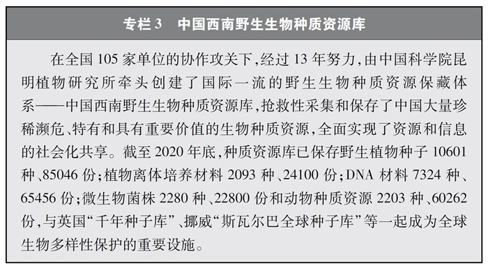 加快重要生物遺傳資源收集保存和利用。中國(guó)高度重視生物資源保護(hù),近年來在生物資源調(diào)查、收集、保存等方面取得較大進(jìn)展。實(shí)施戰(zhàn)略生物資源計(jì)劃專項(xiàng),完善生物資源收集收藏平臺(tái),建立種質(zhì)資源創(chuàng)新平臺(tái)、遺傳資源衍生庫和天然化合物轉(zhuǎn)化平臺(tái),持續(xù)加強(qiáng)野生生物資源保護(hù)和利用。實(shí)施一批種質(zhì)資源保護(hù)和育種創(chuàng)新項(xiàng)目,截至2020年底,形成了以國(guó)家作物種質(zhì)長(zhǎng)期庫及其復(fù)份庫為核心、10座中期庫與43個(gè)種質(zhì)圃為支撐的國(guó)家作物種質(zhì)資源保護(hù)體系,建立了199個(gè)國(guó)家級(jí)畜禽遺傳資源保種場(chǎng)(區(qū)、庫),為90%以上的國(guó)家級(jí)畜禽遺傳資源保護(hù)名錄品種建立了國(guó)家級(jí)保種單位,長(zhǎng)期保存作物種質(zhì)資源52萬余份、畜禽遺傳資源96萬份。建設(shè)99個(gè)國(guó)家級(jí)林木種質(zhì)資源保存庫,以及新疆、山東2個(gè)國(guó)家級(jí)林草種質(zhì)資源設(shè)施保存庫國(guó)家分庫,保存林木種質(zhì)資源4.7萬份。建設(shè)31個(gè)藥用植物種質(zhì)資源保存圃和2個(gè)種質(zhì)資源庫,保存種子種苗1.2萬多份。