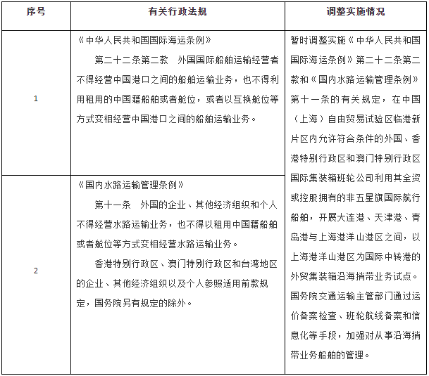 一、按照《中國(上海)自由貿(mào)易試驗(yàn)區(qū)臨港新片區(qū)總體方案》,同意自即日起至2024年12月31日,在中國(上海)自由貿(mào)易試驗(yàn)區(qū)臨港新片區(qū)暫時(shí)調(diào)整實(shí)施《中華人民共和國國際海運(yùn)條例》《國內(nèi)水路運(yùn)輸管理?xiàng)l例》的有關(guān)規(guī)定(目錄附后)。