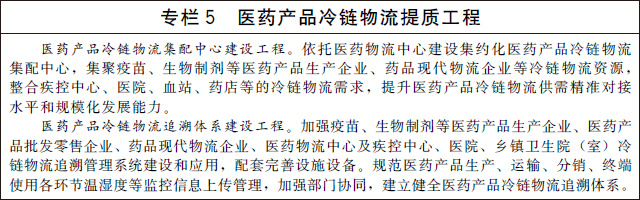 完善醫(yī)藥產品冷鏈物流設施網絡。鼓勵醫(yī)藥流通企業(yè)、藥品現代物流企業(yè)建設醫(yī)藥物流中心,完善醫(yī)藥冷庫網絡化布局及配套冷鏈設施設備功能,提升醫(yī)藥產品冷鏈全程無縫銜接的信息化管理水平。推動醫(yī)藥流通企業(yè)按《藥品經營質量管理規(guī)范》要求配備冷藏冷凍設施設備,支持疾控中心、醫(yī)院、鄉(xiāng)鎮(zhèn)衛(wèi)生院(室)等醫(yī)療網點提高醫(yī)藥產品冷鏈物流和使用環(huán)節(jié)的質量保障水平。加強醫(yī)藥物流中心與冷鏈末端的無縫銜接,鼓勵發(fā)展多溫共配、接力配送等模式,探索發(fā)展超低溫配送,構建廣覆蓋、高效率、低成本、安全可靠的醫(yī)藥產品冷鏈物流網絡。