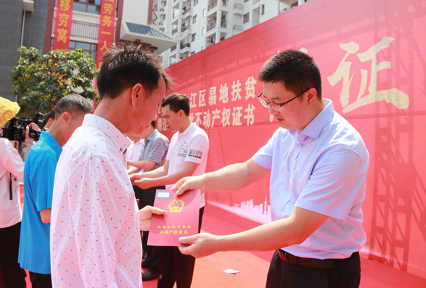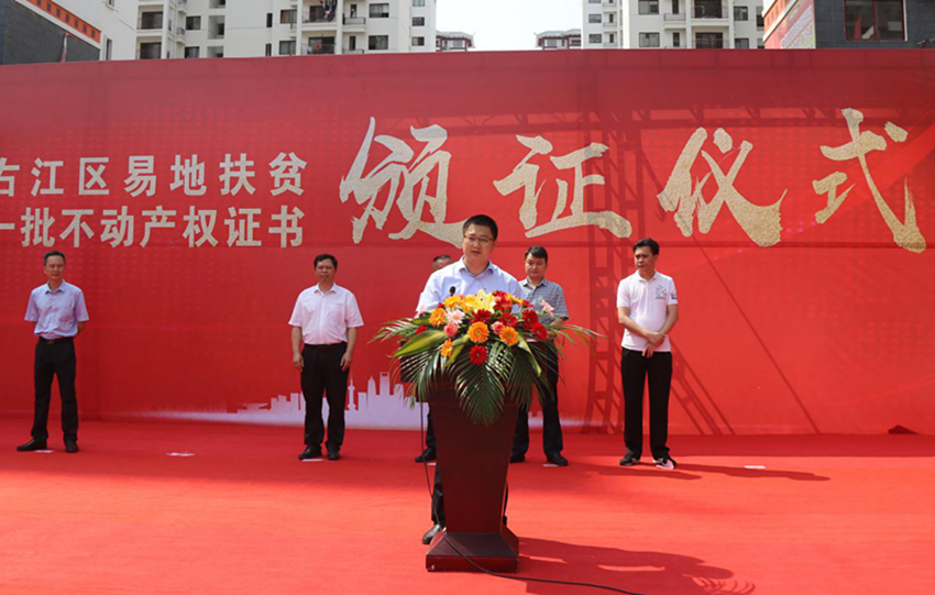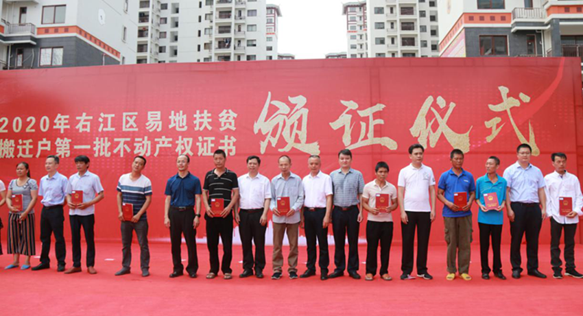 5月16日上午,右江區(qū)“老鄉(xiāng)家園—迎龍易地扶貧搬遷安置小鎮(zhèn)”搬遷戶不動產(chǎn)權(quán)證書頒證儀式在安置小鎮(zhèn)舉行,第一批26戶搬遷戶順利拿到了產(chǎn)權(quán)證書。百色市發(fā)改委副主任、市水庫和扶貧易地安置管理局局長羅加攀,右江區(qū)委常委、區(qū)人民政府副區(qū)長岑萬興,右江區(qū)委常委、宣傳部部長、區(qū)人民政府副區(qū)長王世凡,右江區(qū)委常委、辦公室主任盧靈及右江區(qū)直單位、鄉(xiāng)鎮(zhèn)代表,廣西百色益眾投資有限公司董事長、總經(jīng)理趙家臣出席儀式。儀式由王世凡主持。