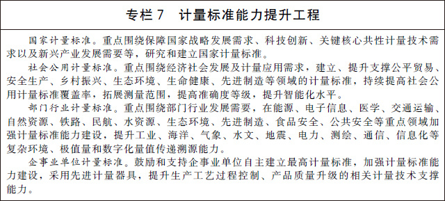 (十九)推進(jìn)計量標(biāo)準(zhǔn)建設(shè)。改革計量標(biāo)準(zhǔn)體系架構(gòu),統(tǒng)籌考慮技術(shù)能力和現(xiàn)實需求,建立國家計量標(biāo)準(zhǔn)、社會公用計量標(biāo)準(zhǔn)、部門行業(yè)計量標(biāo)準(zhǔn)、企事業(yè)單位計量標(biāo)準(zhǔn)為主體的層次分明、鏈條清晰的計量標(biāo)準(zhǔn)基礎(chǔ)設(shè)施網(wǎng)絡(luò)。實施計量標(biāo)準(zhǔn)能力提升工程,在重點領(lǐng)域新建一批國家計量標(biāo)準(zhǔn),加快推進(jìn)各級各類計量標(biāo)準(zhǔn)技術(shù)改造和升級換代。建立嵌入式、芯片級、小型化的計量標(biāo)準(zhǔn),推動對制造過程的實時在線測量和最佳控制。