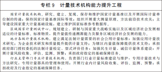 (二十一)加快計量技術(shù)機(jī)構(gòu)建設(shè)。深化計量技術(shù)機(jī)構(gòu)改革創(chuàng)新發(fā)展,優(yōu)化整合國家計量技術(shù)機(jī)構(gòu)、區(qū)域國家計量測試中心、地方各級計量技術(shù)機(jī)構(gòu)和行業(yè)主管部門專業(yè)計量技術(shù)機(jī)構(gòu)。大力推動國家計量技術(shù)機(jī)構(gòu)創(chuàng)新發(fā)展,通過組織開展重大測量原理、方法前沿技術(shù)攻關(guān),建立量子計量基準(zhǔn)并保持國際等效,提供一流的量值溯源和測量服務(wù),支撐國家科技創(chuàng)新、工業(yè)競爭力提升和經(jīng)濟(jì)社會發(fā)展。充分發(fā)揮省級人民政府和行業(yè)主管部門計量基礎(chǔ)設(shè)施規(guī)劃建設(shè)自主權(quán),加強(qiáng)普惠性、基礎(chǔ)性和公益性計量基礎(chǔ)設(shè)施建設(shè)。提升計量技術(shù)機(jī)構(gòu)服務(wù)市場的能力和水平,推動形成一批專業(yè)領(lǐng)域服務(wù)平臺,培育一批專業(yè)化、社會化、網(wǎng)絡(luò)化的服務(wù)機(jī)構(gòu),為經(jīng)濟(jì)社會發(fā)展和行業(yè)創(chuàng)新提供計量測試服務(wù)。