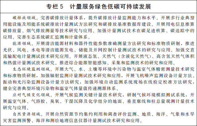(十四)支撐碳達(dá)峰碳中和目標(biāo)實現(xiàn)。完善溫室氣體排放計量監(jiān)測體系,加強(qiáng)碳排放關(guān)鍵計量測試技術(shù)研究和應(yīng)用,健全碳計量標(biāo)準(zhǔn)裝置,為溫室氣體排放可測量、可報告、可核查提供計量支撐。建立碳排放計量審查制度,強(qiáng)化重點排放單位的碳計量要求。在城市和園區(qū)開展低碳計量試點。建立完善資源環(huán)境計量體系,建設(shè)一批國家能源、水文水資源和環(huán)境計量中心,推進(jìn)能耗、水資源、環(huán)境監(jiān)測系統(tǒng)建設(shè),加強(qiáng)能源資源和環(huán)境計量數(shù)據(jù)分析挖掘和利用。加快推進(jìn)能源資源計量服務(wù)示范工程建設(shè),引導(dǎo)和培育能源資源和環(huán)境計量服務(wù)市場。