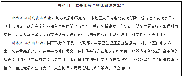 各?。ㄗ灾螀^(qū)、直轄市)要根據(jù)人口老齡化發(fā)展形勢,制定實施專項規(guī)劃,加強與相關(guān)規(guī)劃銜接。各級老齡工作委員會要發(fā)揮統(tǒng)籌協(xié)調(diào)作用,推動老齡工作委員會各成員單位履職盡責,形成工作合力。發(fā)揮養(yǎng)老服務聯(lián)席會議制度作用,推進養(yǎng)老服務體系建設(shè),強化區(qū)域養(yǎng)老服務資源統(tǒng)籌管理。支持城市群、都市圈打造養(yǎng)老服務體系一體化建設(shè)格局,形成服務能力銜接、產(chǎn)業(yè)發(fā)展協(xié)同的合作區(qū)域。支持大型城市和區(qū)域中心城市推動養(yǎng)老產(chǎn)業(yè)集聚發(fā)展,充分發(fā)揮輻射帶動和示范作用。推動以地級行政區(qū)為單位制定“整體解決方案”,將老齡事業(yè)發(fā)展和養(yǎng)老服務體系建設(shè)納入經(jīng)濟社會發(fā)展全局中通盤考慮,全方位整合資源力量,充分調(diào)動各方積極性,推動兜底性、普惠型、多樣化三種路徑協(xié)同發(fā)展。